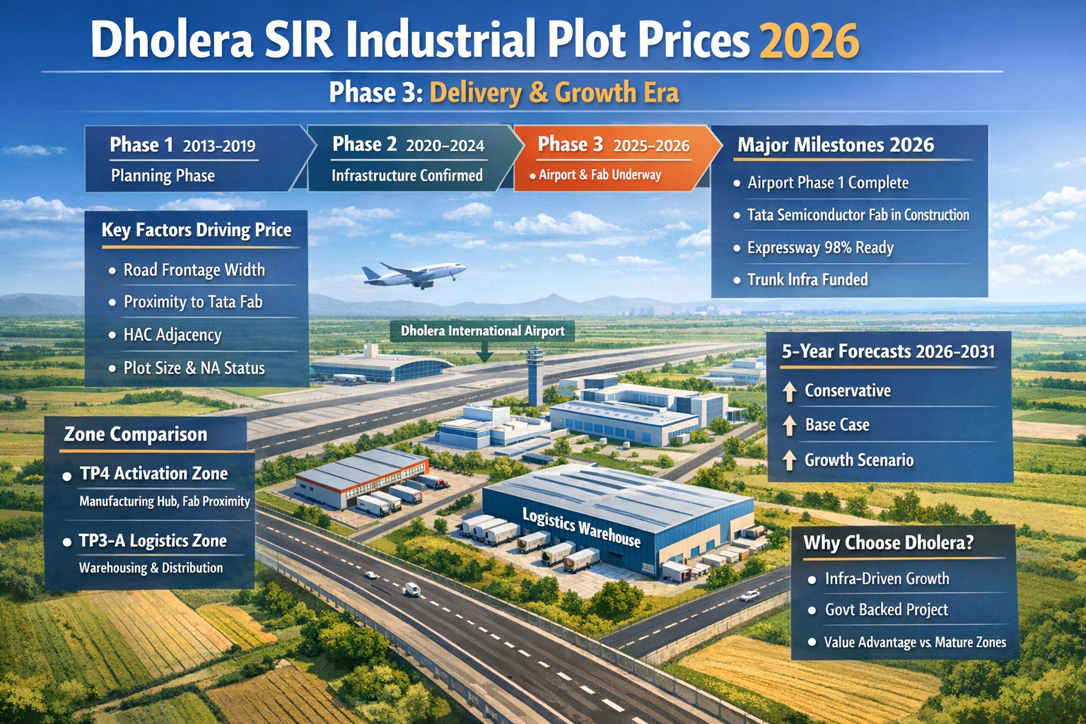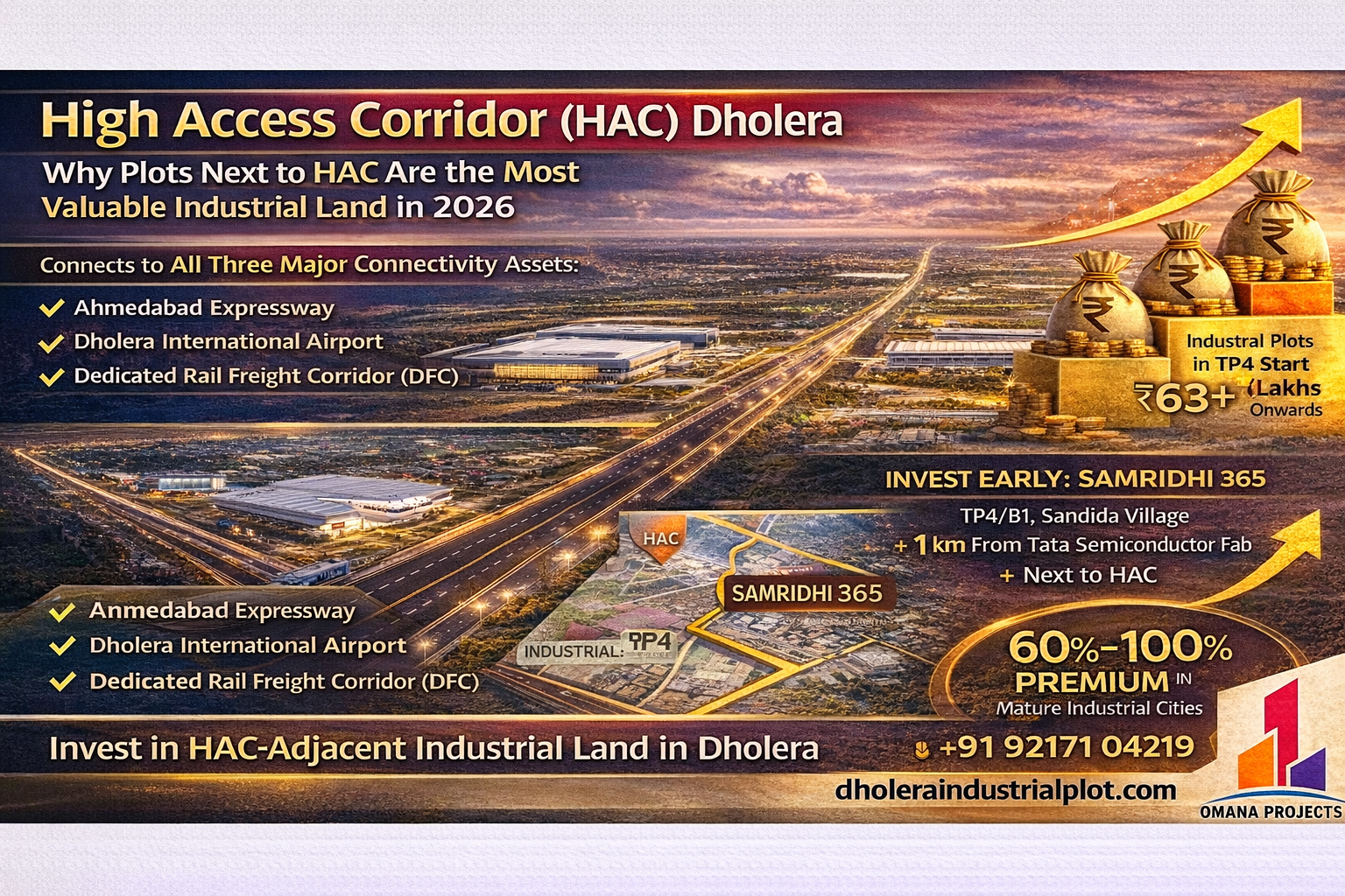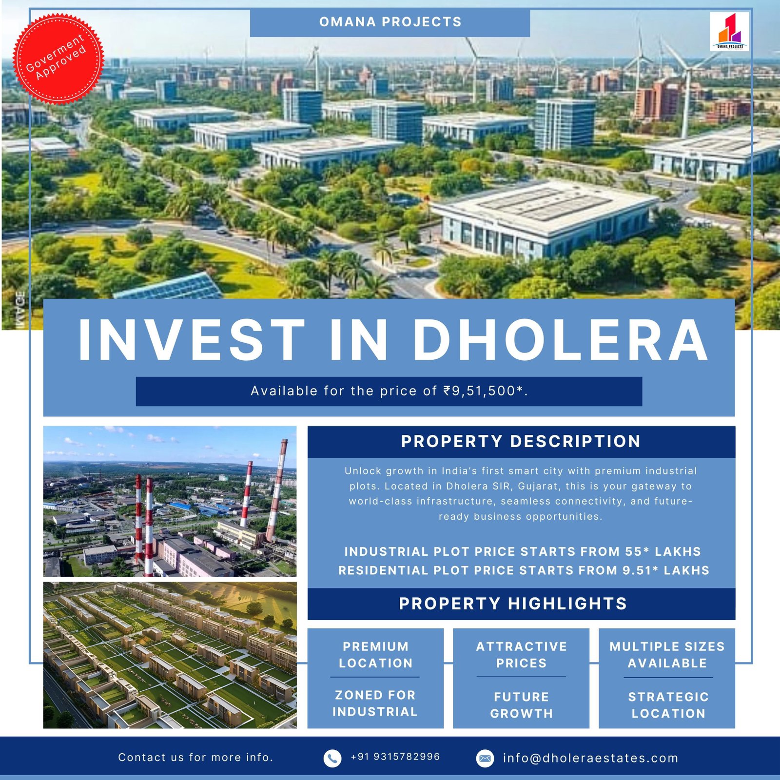 At omana projects, we help businesses secure high-potential industrial plots in Dholera SIR — India’s most advanced greenfield smart city, developed under the Delhi-Mumbai Industrial Corridor (DMIC). Backed by the Government of India, Dholera is the future of manufacturing, logistics, and industrial growth.